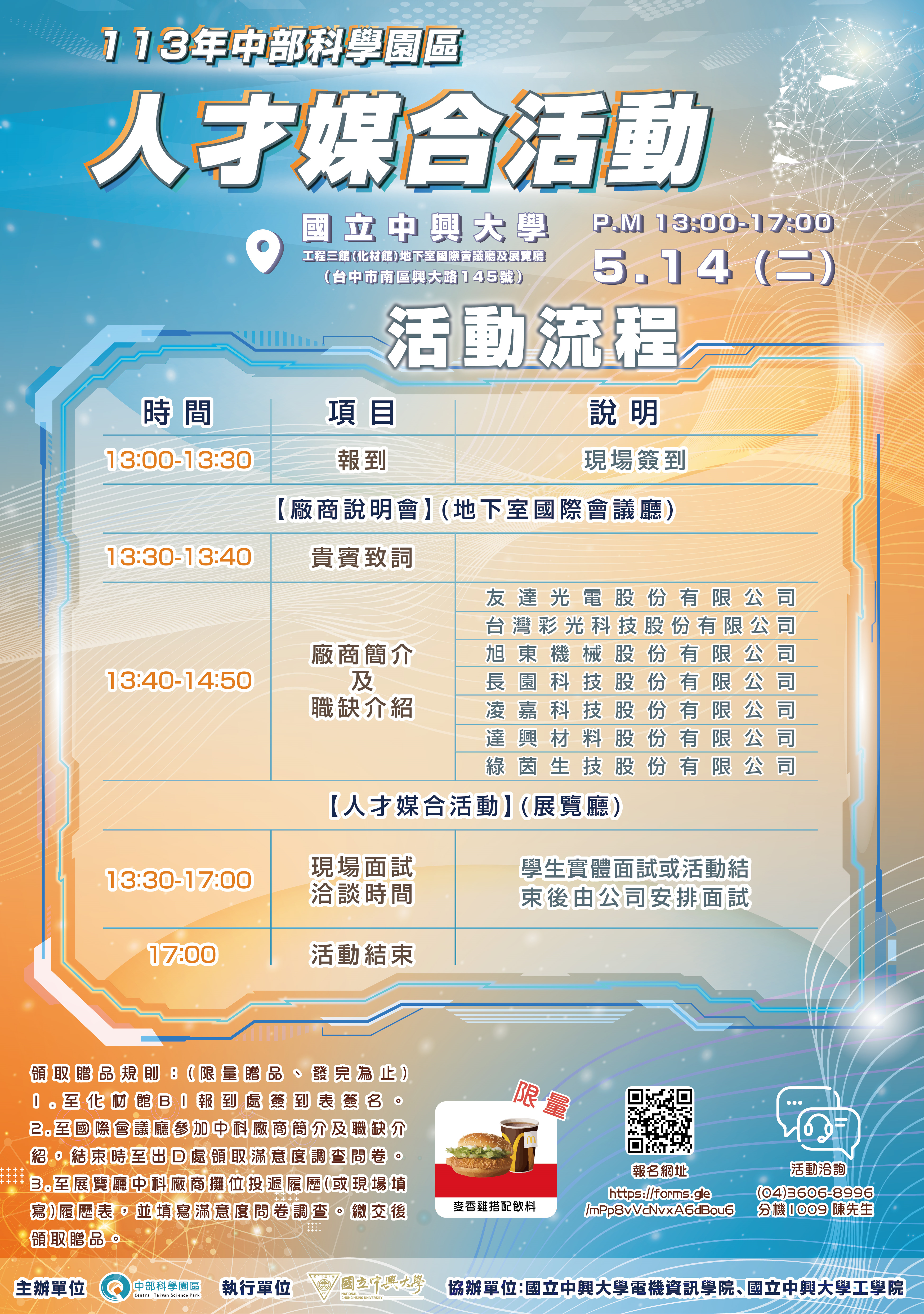 本校將於113年5月14日(二)13:00~17:00於本校化材館B1國際會議廳及展覽廳舉辦「中部科學園區人才媒合活動」,本次邀請7家中部科學園區廠商參與徵才,藉由活動媒合大學院校應屆畢業學生進入中部科學園區就業,以期能夠提升園區廠商研發能力及創新能力,並創造更高價值的產能及業績。