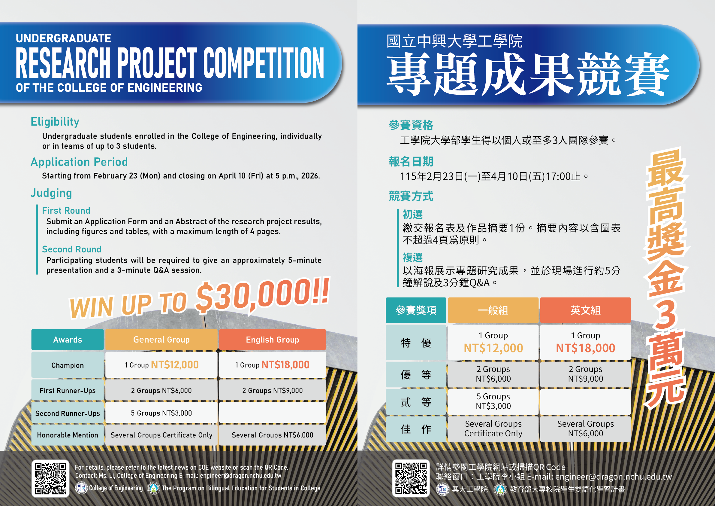 【工學院專題研究成果競賽】即日起開放報名,收件至115年4月10日(五)17:00截止,歡迎踴躍參加!